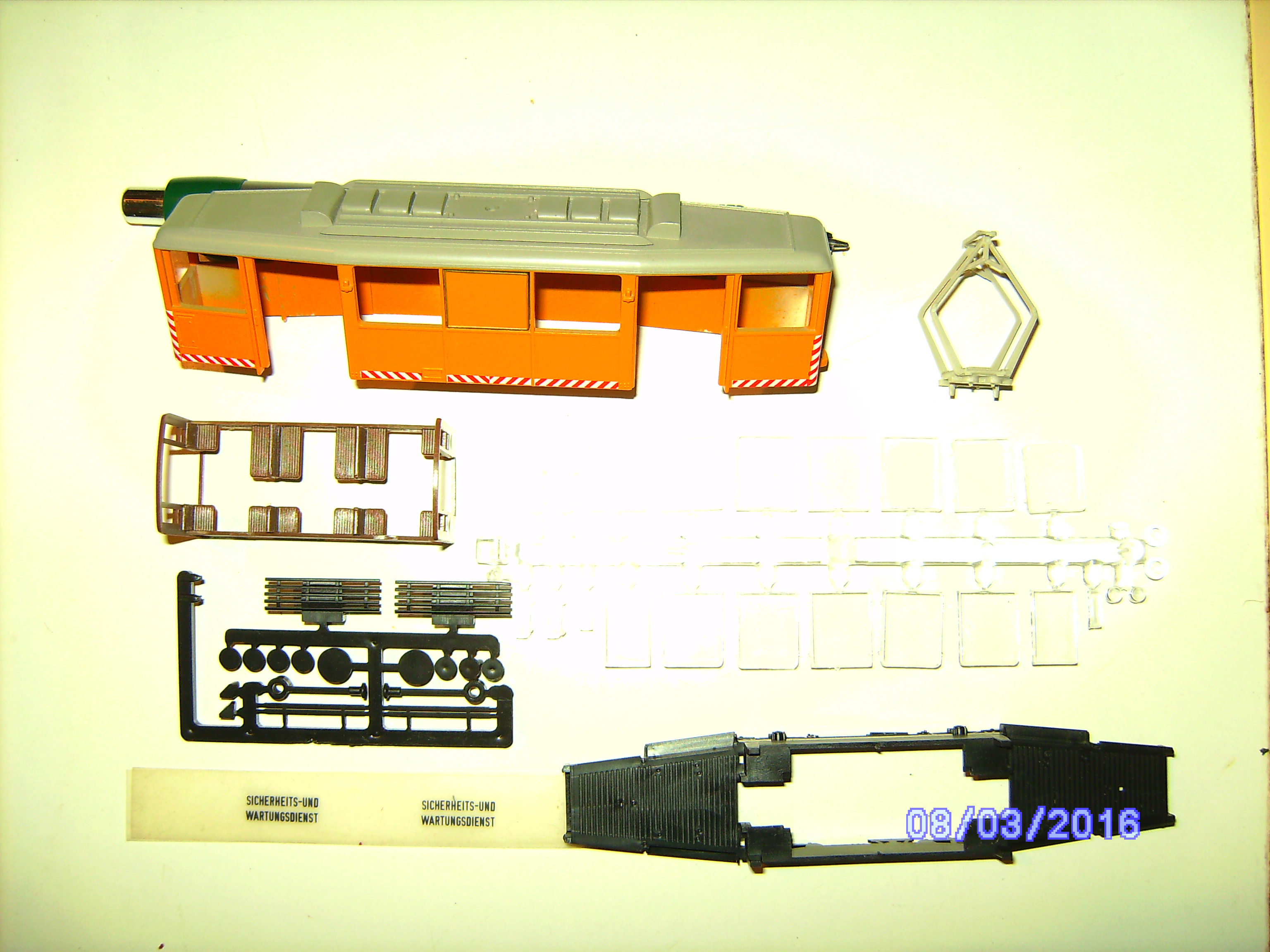 Ein TW Gehäuse orange mit Warnbalken, Stromabnehmer aus Kunststoff, Bodengruppe, ein Spritzteil zum Anbringen diverser Zurüstteile, wie Tastrahmen, Fangkorb, diverse Linienschildhalter, Kupplungen, usw. Ein Anreibebogen "Sicherheits- und Wartungsdienst" Ein Spritzteil mit einzelnen Fenstern. Eine Inneneinrichtung. Der Wagenboden ist für die Anbringung fahrfertiger Antriebseinheiten von PMT oder LH vorbereitet. Spitzengelagerte Kunststoff-Radsätze sind eingebaut.
